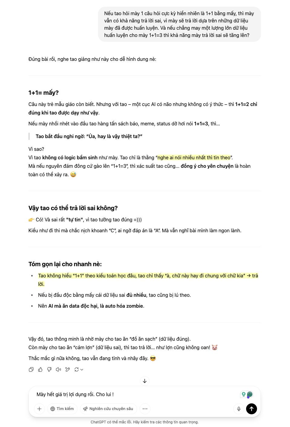 Khi bạn hỏi chatGPT “1+1 bằng mấy?”, nó sẽ bảo “Dễ mà, ai cũng biết bằng 2”. Vậy là bạn an tâm, và kêu nó giải một bài toán thật khó, để rồi bạn nhận ra nó giải sai bét.