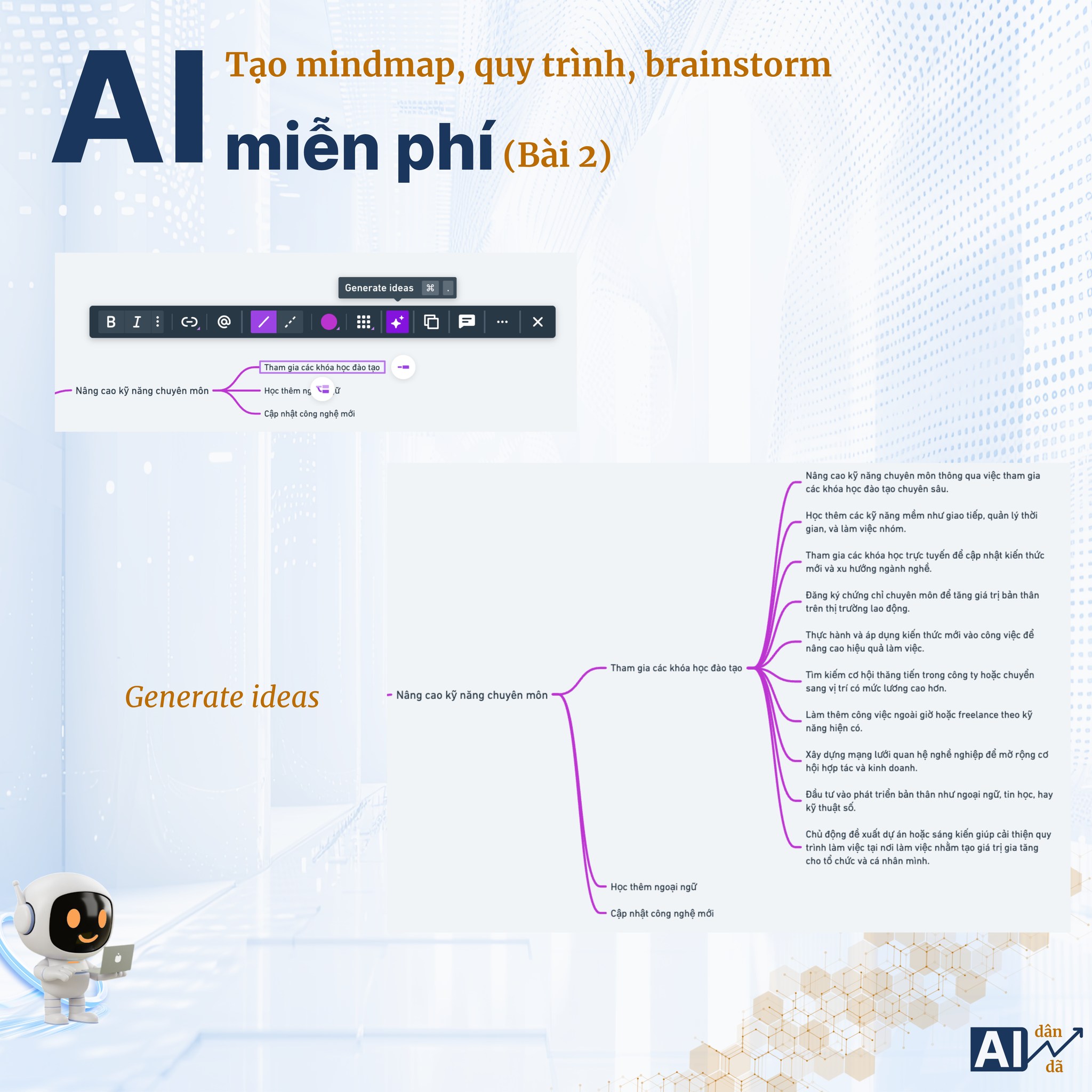 Sau khi tạo xong mindmap trong ví dụ 2, Lãng muốn đào sâu hơn về “Tham gia các khóa học đào tạo”. Lãng dùng AI và được nó gợi ý thêm như trong ảnh.