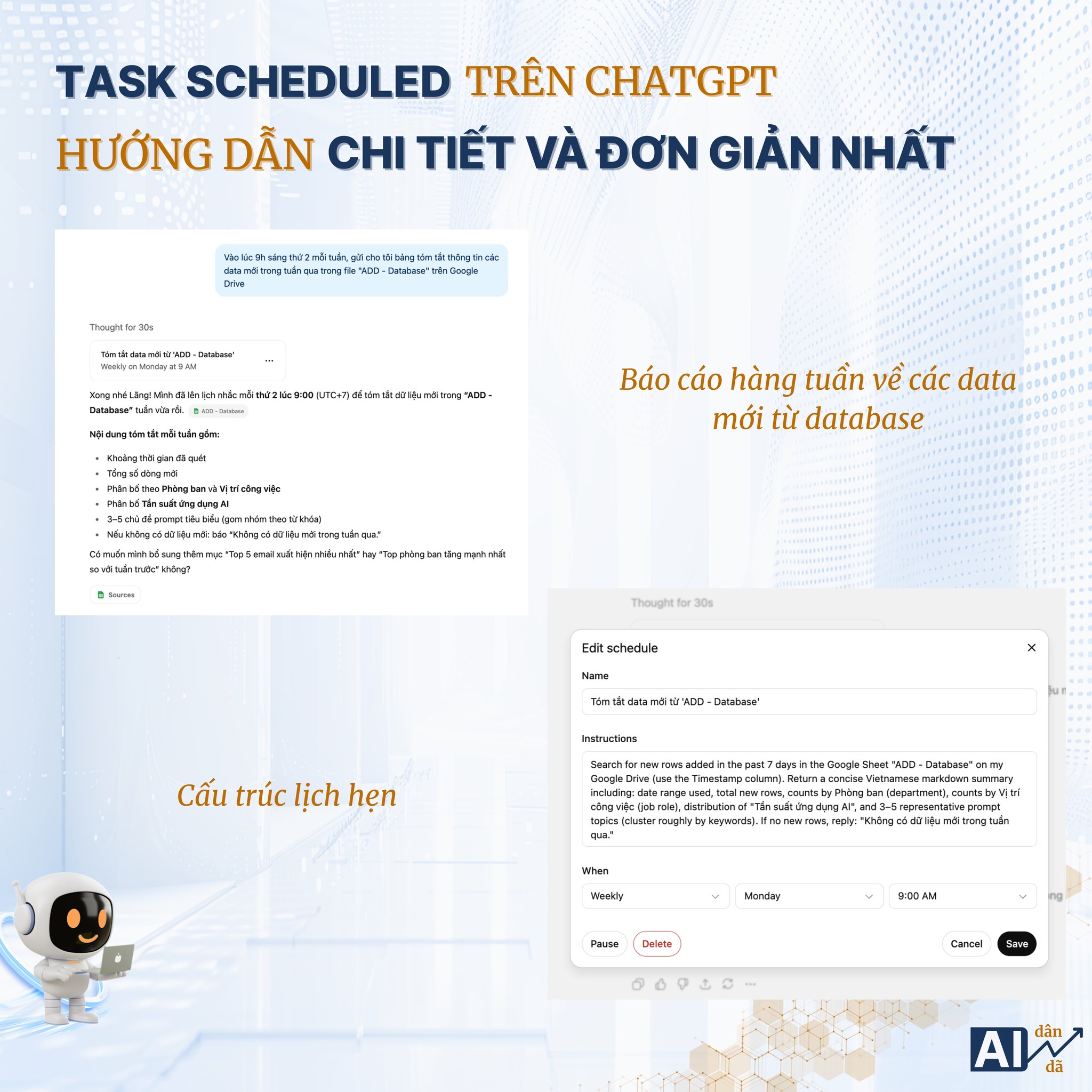 Cú pháp ra lệnh bạn có thể copy và dùng: “Vào lúc <thời gian> giờ Việt Nam, <chu kỳ lặp lại>, hãy <mô tả nhiệm vụ cần làm>. Kết quả trả về sẽ <mô tả yêu cầu đầu ra>”
